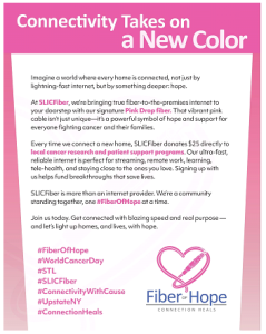 اعتباراً من 4 فبراير 2026، ستتبرع شركة SLICFiber بمبلغ 25 دولاراً عن كل مشترك جديد يقوم بالاشتراك في خدمة الإنترنت عبر الألياف الضوئية الخاصة بها، حيث سيتم توجيه هذه التبرعات إلى الجمعيات المحلية الداعمة لمرضى السرطان في المناطق التي توسّع الشركة خدماتها فيها.