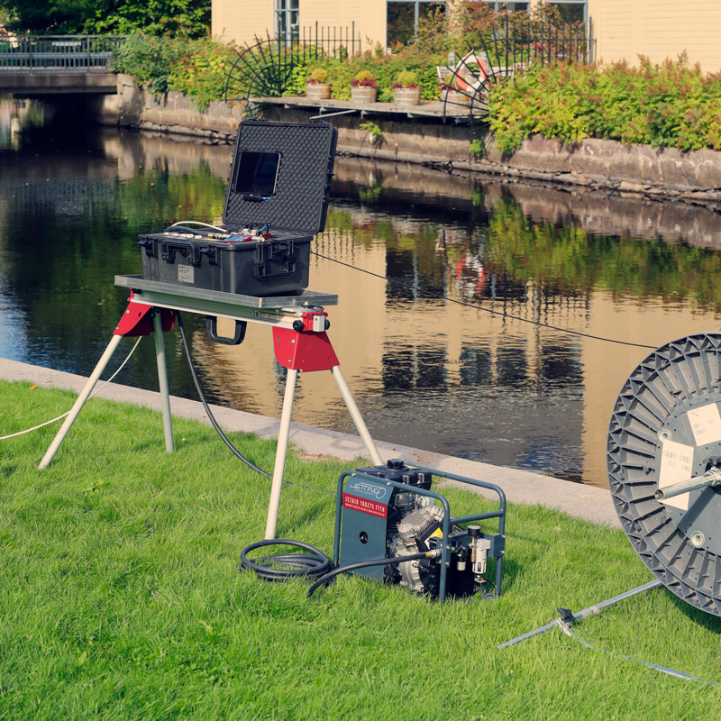 In floating installations, water is connected to the machine’s air intake to carry the cable forward. Motors are powered by air, but installation is done entirely using water. This reduces friction and allows cable to be installed easily — even in narrow or slightly compressed ducts — for distances up to 33,000 ft (10 km) in one run.